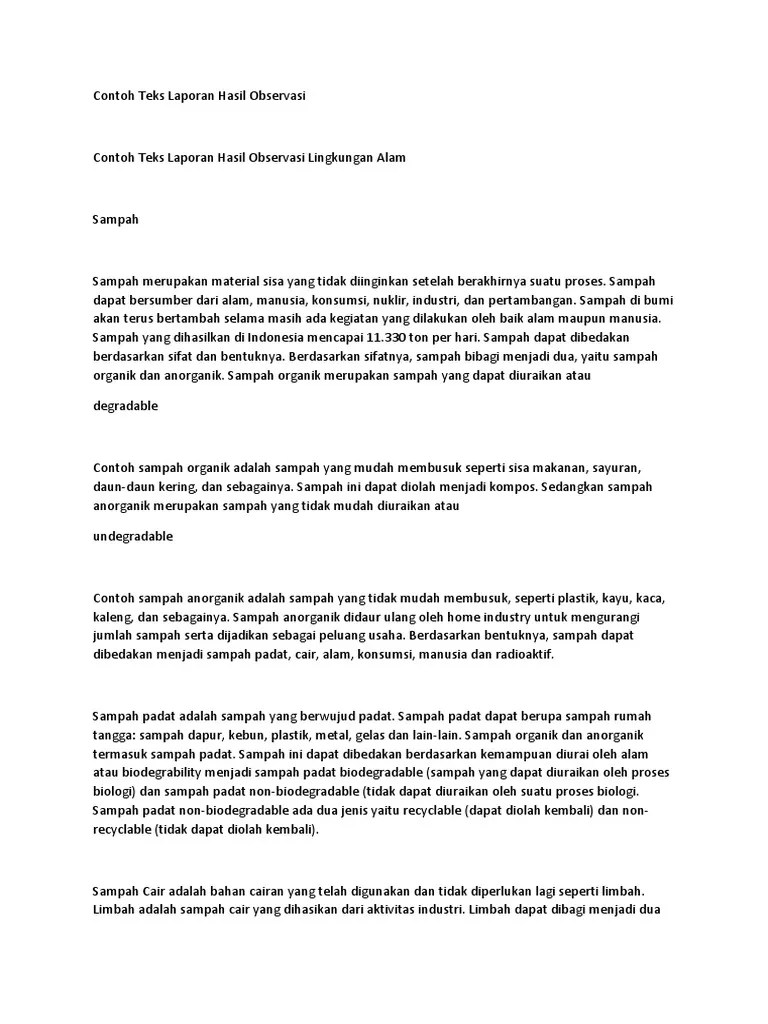 14+ contoh teks laporan hasil observasi lengkap beserta strukturnya. Contoh teks laporan hasil observasi singkat tentang hewan, tumbuhan, lingkungan, alam, sekolah beserta strukturnya, pengertian dan struktur teks observasi. ⏩ contoh laporan observasi singkat tentang alam ☑️ hewan . Kumpulan contoh teks laporan hasil observasi yang baik dan benar tentang hewan, tumbuhan, alam, fenomena, keindahan, bencana, sampah dll. Nah kalau kamu bingung yuk simak beberapa contoh laporan hasil observasi pada artikel berikut ini.